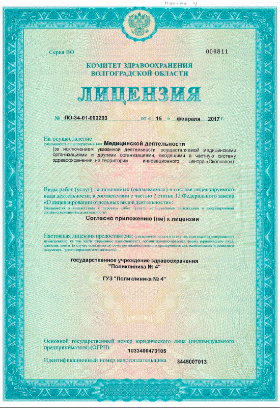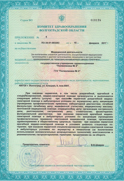 Государственное учреждение здравоохранения «Поликлиника №4» г. Волгограда - амбулаторно-поликлиническое учреждение, в состав которого входят: поликлиника, круглосуточный травматологический пункт, женская консультация и Центр здоровья. Учреждение с плановой мощностью 1050 посещений в смену, обслуживающее 28 050 человек прикрепленного населения Ворошиловского района города Волгограда. Для качественного и своевременного обследования и лечения пациентов учреждение имеет мощную диагностическую базу. В поликлинике проводятся такие исследования, как рентгенография, рентгеноскопия, маммография, ультразвуковая диагностика внутренних органов, эхокардиография, функциональная диагностика (холтеровское мониторирование ЭКГ, суточное мониторирование артериального давления СМАД), электроэнцефалография (ЭЭГ), определение функции внешнего дыхания — ФВД, урофлоурометрия, лабораторная диагностика. Квалифицированные специалисты владеют методиками нетрадиционной медицины – гирудотерапия, озонотерапия, лазеротерапия. В Центре здоровья пациенты могут пройти обследование на современной диагностической аппаратуре, получить рекомендации врача по здоровому образу жизни и коррекции факторов риска неинфекционных заболеваний. В учреждении работает физкультурно-оздоровительное отделение (сауна, тренажерный зал), инфракрасная сауна.