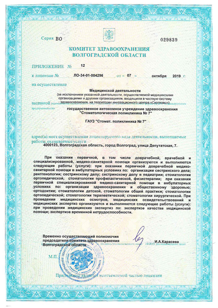 Филиал стоматологии №7 на ул. Депутатская г. Волгограда - это клиника, оказывающая услуги в области детской и взрослой стоматологии по программе ОМС и на платной основе. В клинике проводятся профилактические процедуры, пломбирование зубов, лечение корневых каналов, отбеливание зубов, все виды протезирования, ортодонтическое лечение аппаратами и брекет-системами, зубосохраняющие операции. Имплантологи стоматологии №7 работают с большим перечнем систем для имплантации от лучших мировых производителей. Клиника оснащена современным медицинским и диагностическим оборудованием.